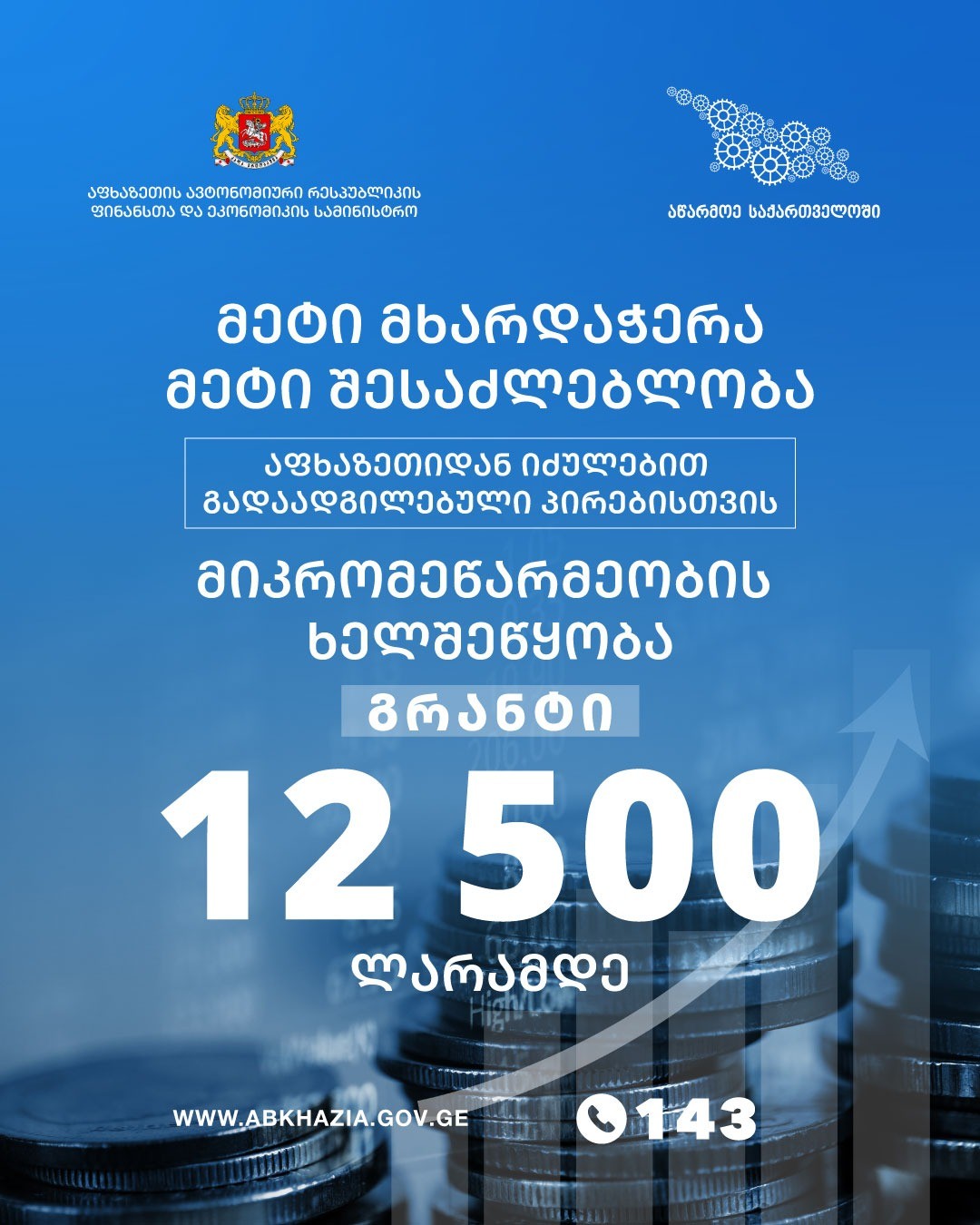 მიზანი: აფხაზეთიდან იძულებით გადაადგილებული პირების მიკრომეწარმეობაში ჩართვის სტიმულირება, მათი სამეწარმეო პოტენციალისა და კონკურენტუნარიანობის გაზრდა.