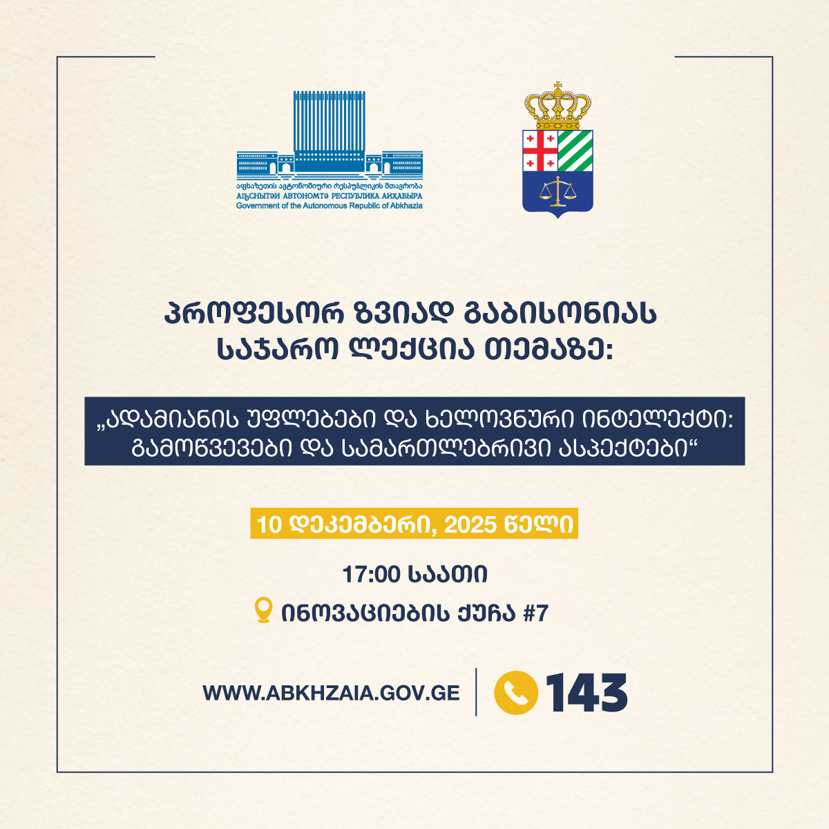 აფხაზეთის ავტონომიური რესპუბლიკის იუსტიციისა და სამოქალაქო ინტეგრაციის სამინისტრო, აფხაზეთის მთავრობის თავმჯდომარის მხარდაჭერით, ატარებს საჯარო ლექციას თემაზე „ადამიანის უფლებები და ხელოვნური ინტელექტი: გამოწვევები და სამართლებრივი ასპექტები“.