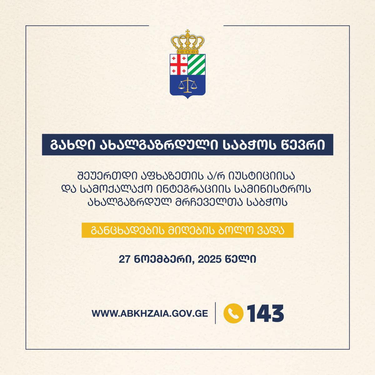 აფხაზეთის ავტონომიური რესპუბლიკის იუსტიციისა და სამოქალაქო ინტეგრაციის სამინისტრო აცხადებს კონკურსს ახალგაზრდული მრჩეველთა საბჭოს წევრების შესარჩევად.